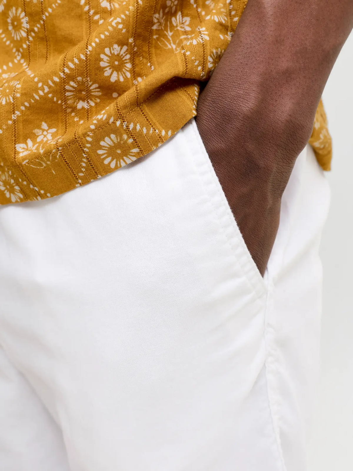 Bermuda con goma y cordón. De color blanco. Con bolsillos en los costados y dos en la parte posterior. Tejido fino y muy fresco y de tacto suave y agradable. Tejido de buena calidad y fácil lavado. Fabricado con concepción ecológica y responsabilidad medio ambiental. Una prenda básica, polivalente y perfecta para todos aquellos amantes de la sobriedad y del minimalismo. Además no tiene fecha de caducidad y es un candidato ideal para cualquier fondo de armario. Máxima comodidad y comfort para tus múltiples looks. Y por un precio realmente espectacular. Acertarás con la compra. Estilo casualwear.
