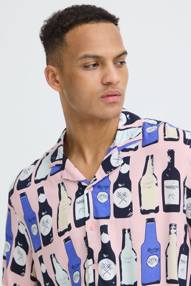 Camisa m/c viscosa con estampado botellas. De color rosa y estampado multicolor. Con botonadura al tono. De cuello bowling. De patronaje regular. Tejido ligero y de tacto suave y agradable. Tejido de buena calidad y fácil lavado. Fabricado con concepción ecológica y responsabilidad medio ambiental. Tradición y vanguardia, unidas de la mano. Una camisa, de inspiración hawaiana, pero 100 % actual y contemporánea. Además es una prenda perfecta para todos aquellos que quieran añadir un toque de color a sus looks. Y con una gran relación calidad - precio. Acertarás con la compra! Estilo casualwear.