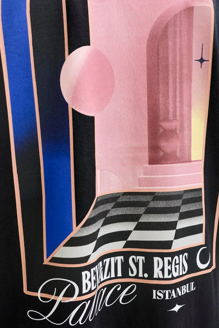 Camiseta m/c con backpint Palace. De color negro y serigrafiía multicolor. De patronaje regular. De cuello redondo. Tejido fino y de tacto suave y agradable. Tejido de buena calidad y fácil lavado. Fabricado con concepción ecológica y responsabilidad medio ambiental. Una prenda con un backprint desenfadado que siempre refrescará tus looks más informales. Además es una pieza ultraversátil, polivalente e ideal para diversificar tu fondo de armario. Y con una relación calidad - precio excelente. Apuesta al negro, valor seguro! Estilo casualwear.<br/>
