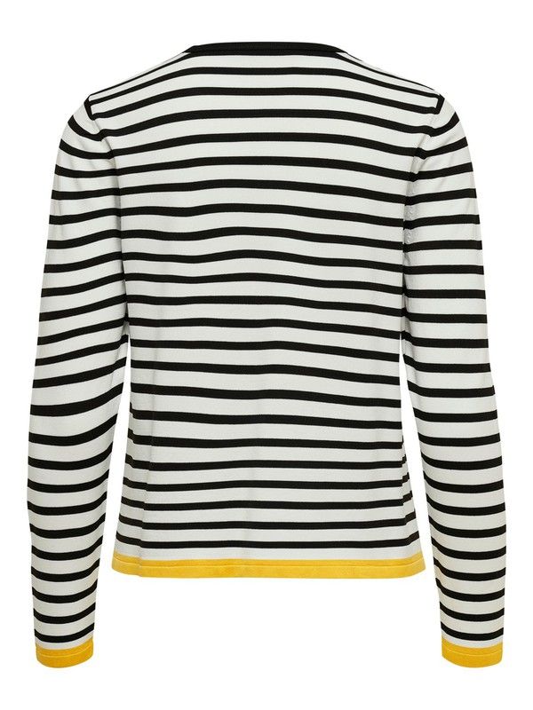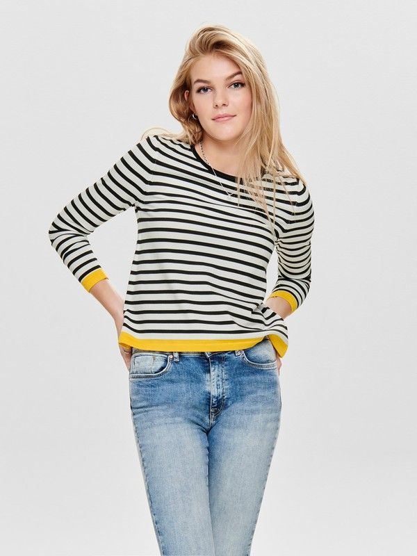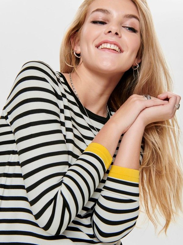 Jersey corto con cuello redondo y rayas. Rayas horizontales finas y con detalle contrastado en amarillo. De tejido suave, fino y agradable. Tejido de buena calidad y fácil lavado. Elegante, cosmopolita y femenino. Perfecto para combinar con un blazer ejecutivo entallado. Una prenda clásica que se convertirá en un auténtico comodín de tus combinaciones black & white. La moda no esta reñida con la comodidad. Seducción a primera vista. Estilo casualwear.<br/>